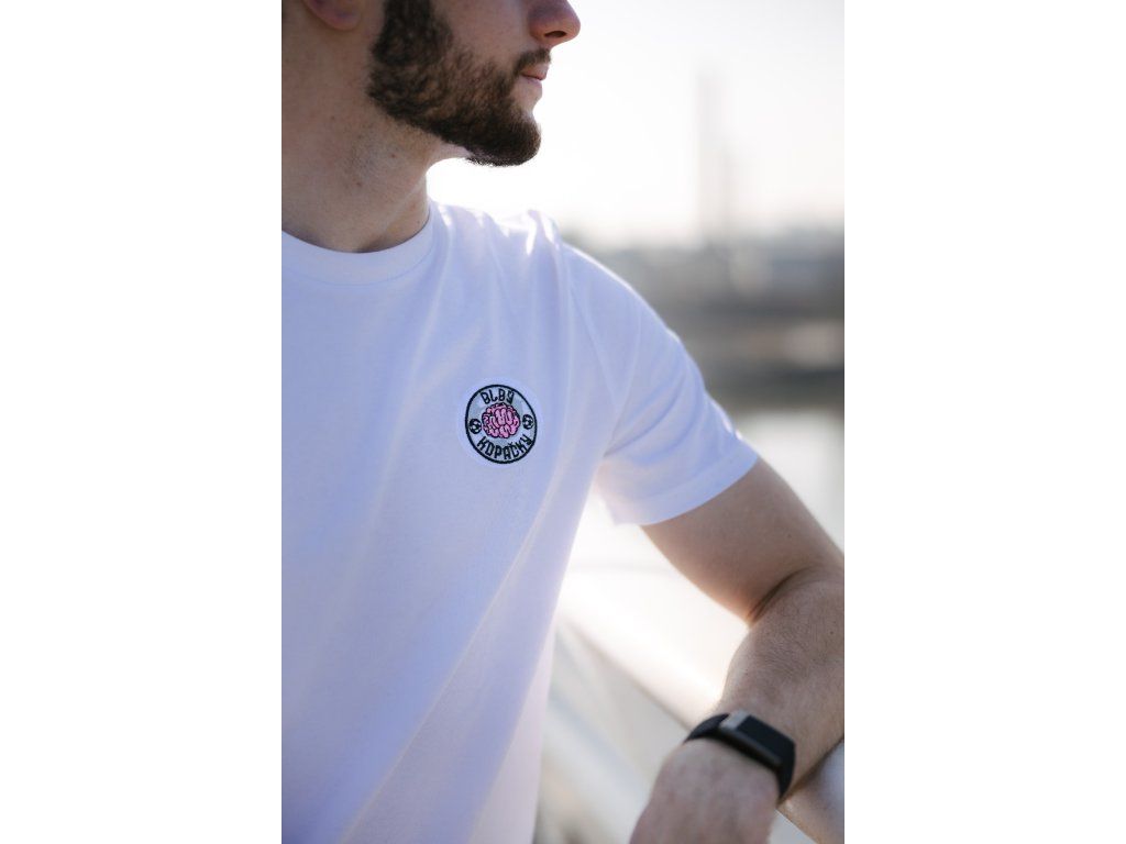Bílé triko BlbýKopačky s vyšívaným logem. 100% bavlna, pokyny k péči uvnitř trika.